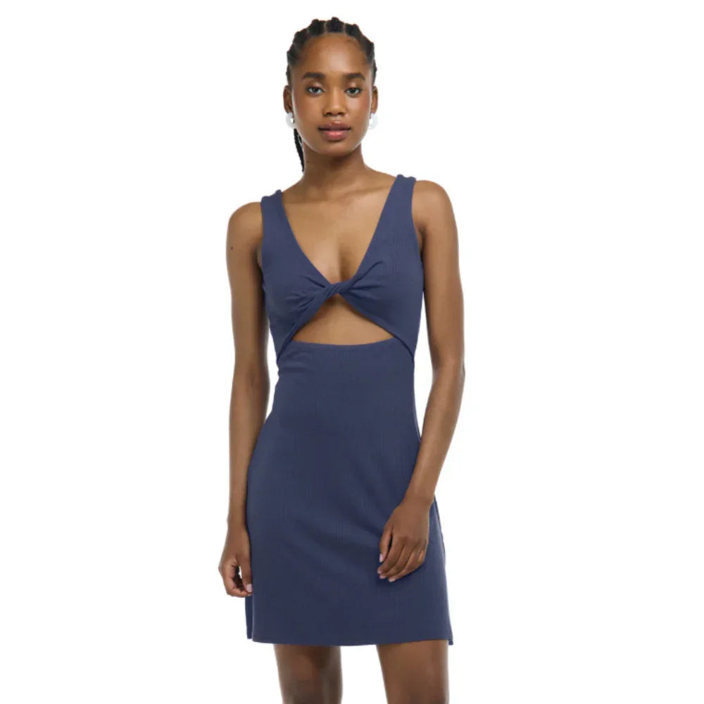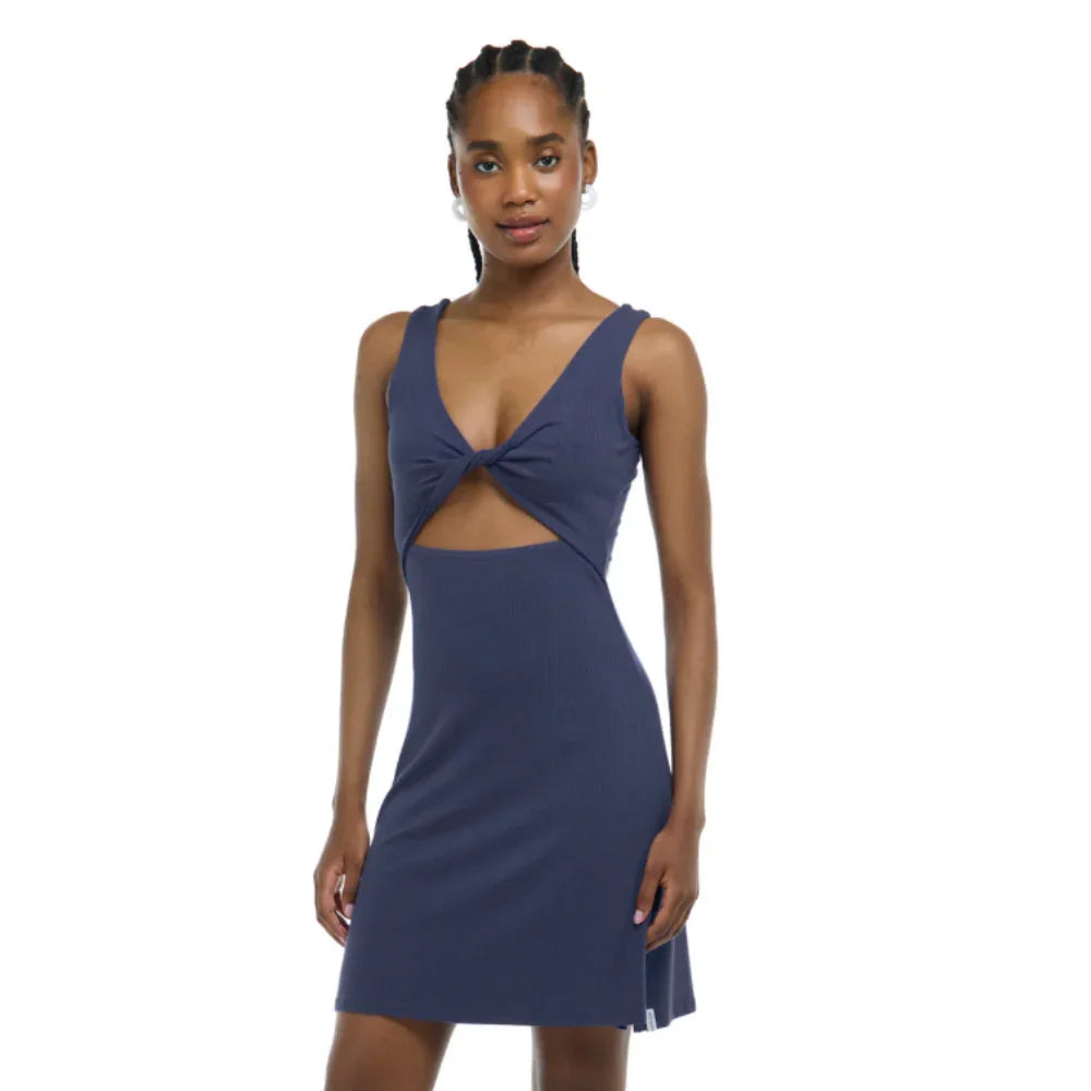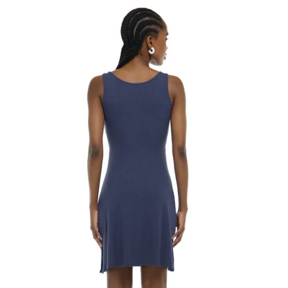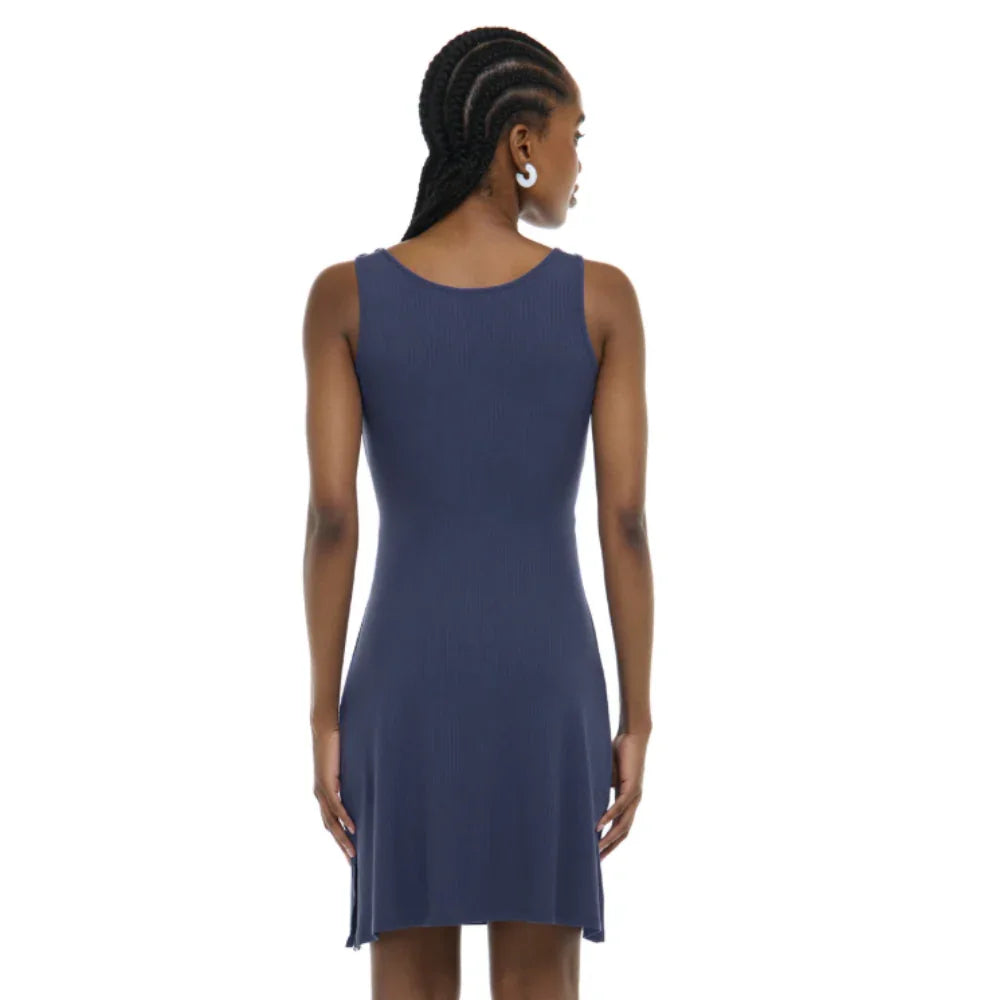 The Syra Dress is made from ribbed knit rayon fabric with a touch of spandex for comfort. Featuring a stylish side slit, it can be worn back-to-front with a keyhole twist drape at the front. With a full coverage back and knee-length design, this dress is versatile and chic.