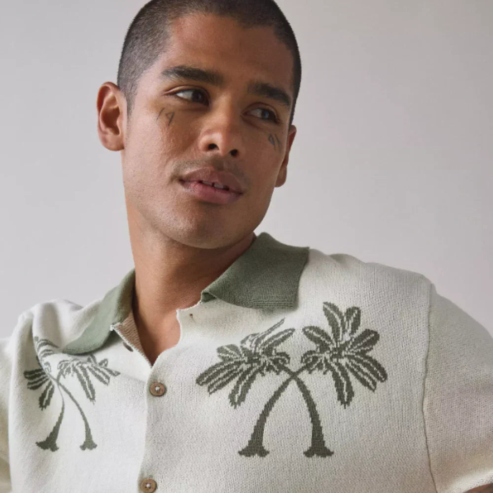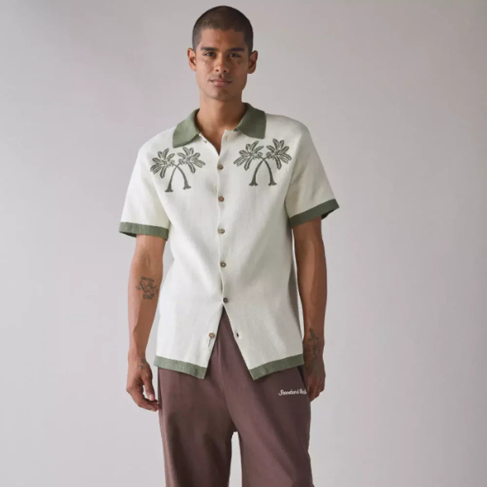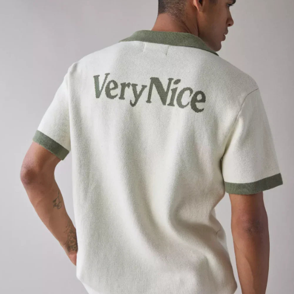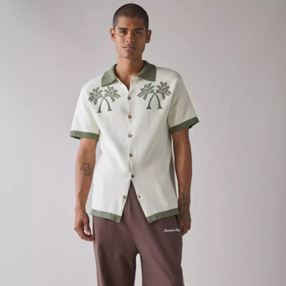Knit short sleeve sweater by The Critical Slide Society featuring a palm motif at the front and "Very Nice" text at the back. Slightly fitted short sleeve style with a button-down front and collar. Finished with ribbing trims. This elevated everyday style pairs with your favorite jeans, shorts and more.